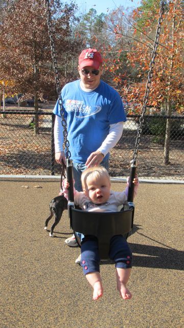 So, I know I can’t say it enough, but the Town of Cary does a great job with creating playgrounds with the spongy surface, which is so nice for the really small crawlers and cruisers! Ashley and Lucy had a fantastic time roaming through the climbing structures, swinging on the tot swings, crawling from one end of the playground to the other, all the while trying to sneak a taste of the nearby mulch chips! This would be a great park to bring your lunch followed by a romp around the playground.