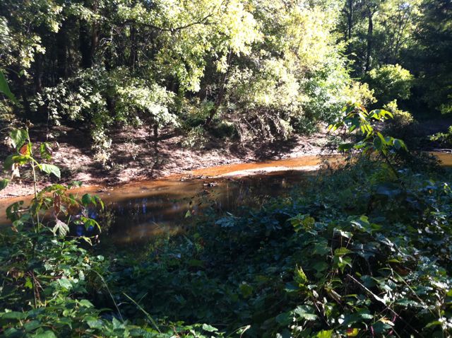 After exhausting the playground, we consulted Google Maps to find a sandy splashing area along Jordan’s Branch. Thinking we had the spot realized, we hopped into our cars and drove up the street closer to Shelter #1. We walked along the left side of Shelter #1 on Young’s Pond Ln and turned left onto a trail opening at the bottom of the small hill. The narrow trail meandered through the woods with the creek to the right. We wanted to find an easy access point to the creek with sandy areas on the opposite side. After 1/2 mile hike through the woods we succumbed to hungry voices and picnicked on the trail. While little people ate lunch, a few of us ran ahead to find the easy creek access. We stopped a little too soon – the easy creek access was less than 50 yards ahead.